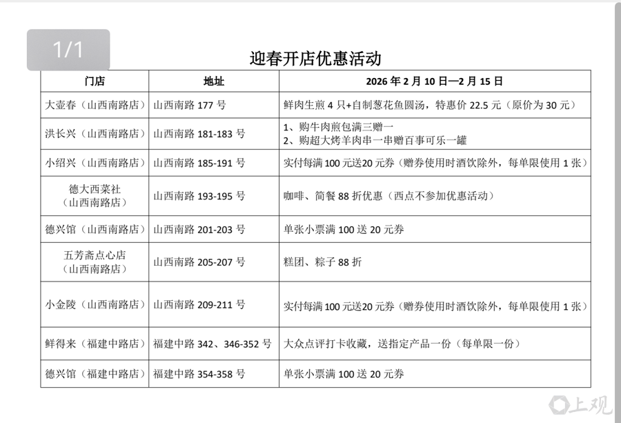 刻下,杏花楼集团对山西南路、福建中路上的过渡规划用时事已完成了时事合座加固均验收及格。旗下各老字号店铺的内装瞻望于本月底完成,2月10日前将统共开业。届时,鲜得来和德兴馆在福建中路再行开店,大壶春、洪长兴、小绍兴、德大、五芳斋和小金陵等在山西南路上开门贸易。山西南路将挂牌“老字号小吃街”,成为南京路商圈一条闪亮的特色支马路。